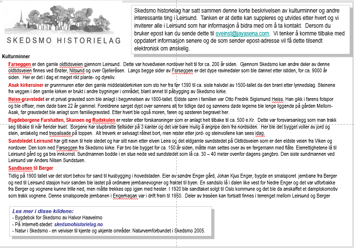Bilder Skedsmo Historielags historiske foto del 1 (1-29) Digitalt Museum – Skedsmo Gårder i Skedsmo Bombing av Kjeller 18.11.1943 Leirsundområdet kulturminnekart Leirsundområdet kulturminnekart tekst 1 Leirsundområdet kulturminnekart tekst 2 Lik Laster inn...